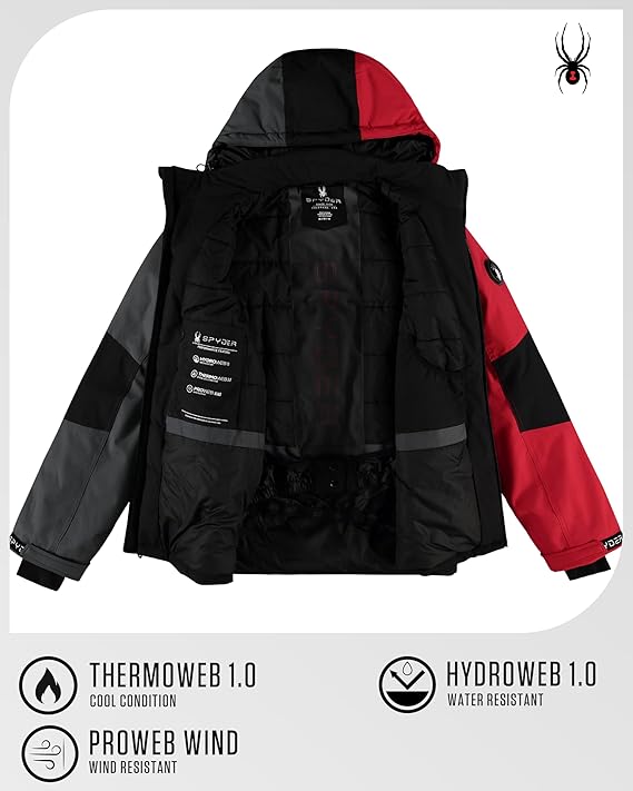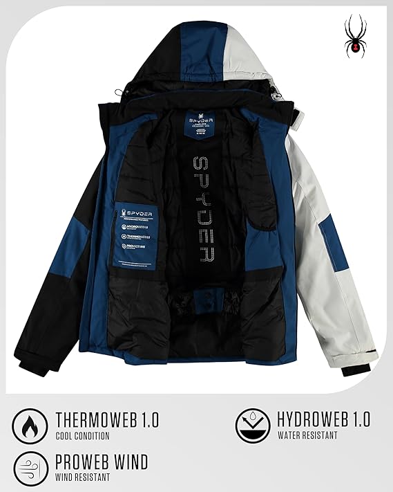 Insulated ski jacket with detachable hood. Breathable and waterproof for harsh slopes.
